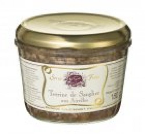 Zutaten: Schweinefleisch und Schweinefett, Schweineleber, Wildschweinfleisch 30%, Milch, Rotwein, Preiselbeeren 1,5%, cognac, Salz, Pfeffer, Gewürze.
