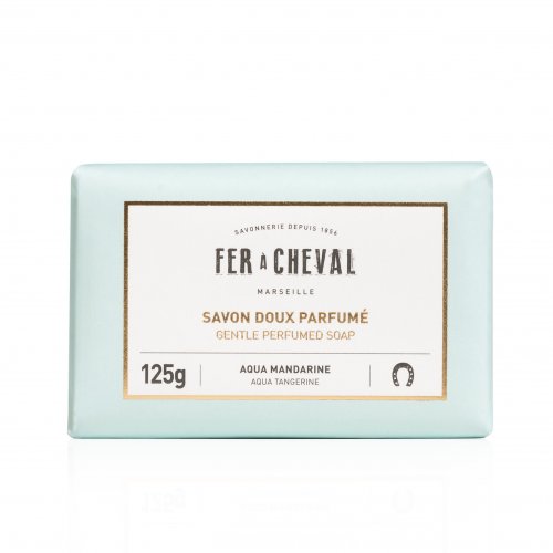 Hier bieten wir eine milde Marseille Seife mit mit Aqua- und Mandarinenduft von "Le Fer à Cheval" an. Ein 125 g Stück.